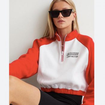 - Áo nỉ cotton pha trộn dáng lửng với các mảng màu tương phản (trắng & đỏ)