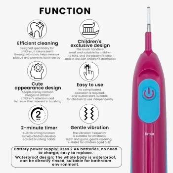 - Có tay cầm tiện dụng phù hợp cho bàn tay trẻ nhỏ, có đồng hồ hẹn giờ 2 phút báo hiệu khi trẻ đã đạt đến thời gian đánh răng khuyến nghị là 2 phút.
