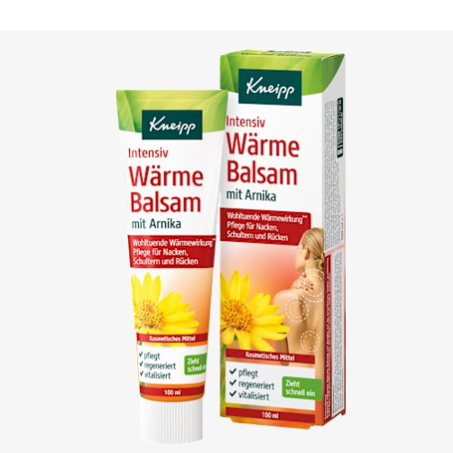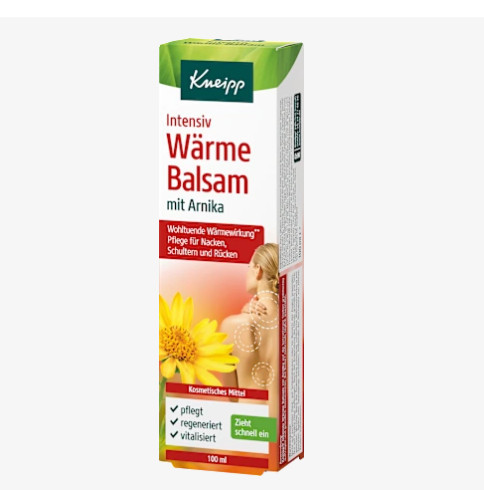 - Dầu dưỡng ấm chuyên sâu Kneipp với chiết xuất từ Arnika hữu cơ chăm sóc làn da sau khi hoạt động thể chất và ngăn ngừa đau nhức cơ bắp. Thông qua massage chuyên sâu, các cơ được thư giãn và kích hoạt lại, dầu dưỡng cũng thích hợp để massage vùng cổ vai và lưng.