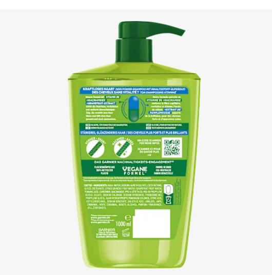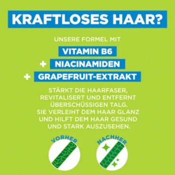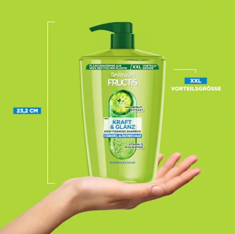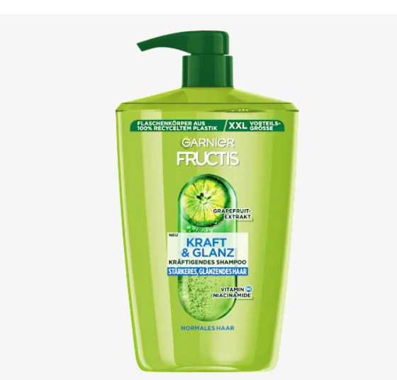 Dầu gội Garnier Fructis Shampoo Kraft & Glanz với chiết xuất bưởi, vitamin B3 và Bó giúp tóc lấy lại sức mạnh và năng lượng, tăng cường và tỏa sáng.