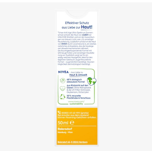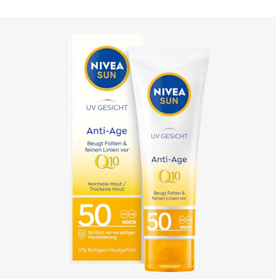 Kem chống nắng NIVEA SUN UV Gesicht Anti-Age Sonnenschutz Q10 là kem chống nắng mới của NIVEA dành cho mặt. Sản phẩm có ưu điểm vượt trội so với các loại kem chống nắng khác với 0% nhờn dính, được bổ sung thêm tỉnh chất Q10 chống lão hóa, giảm nếp nhăn và làm mờ các đốm sắc tố nâu trên da, thực sự là sản phẩm lí tưởng cho mùa hè.