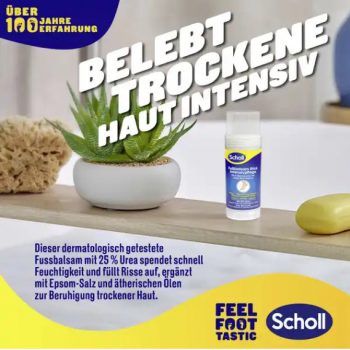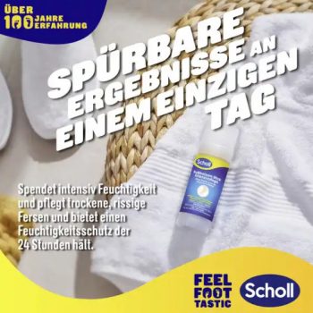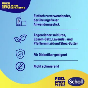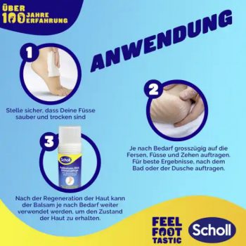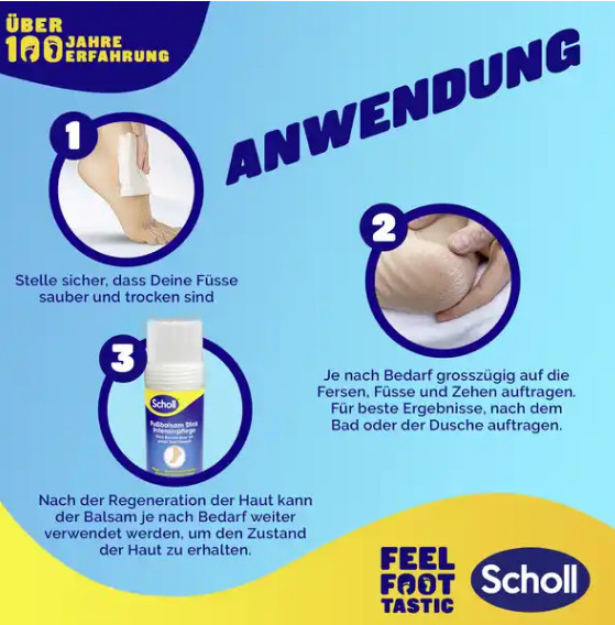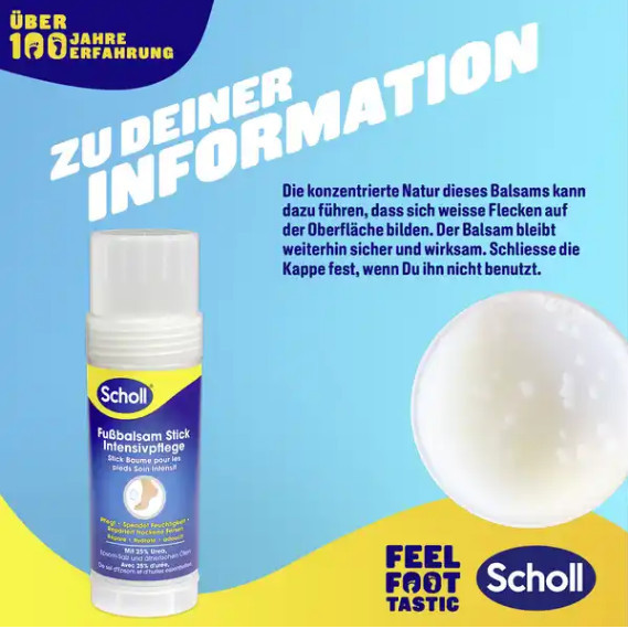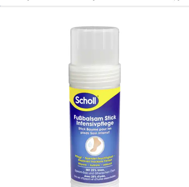 Kem dưỡng chân nứt nẻ Scholl Fußbalsam Stick với các thành phần cô đặc, cung cấp độ ẩm chuyên sâu cho những vùng da cần được chăm sóc đặc biệt ở bàn chân. Chất kem dưỡng lướt nhẹ nhàng trên da, dưỡng ẩm sâu cho gót chân khô nứt nẻ, đồng thời để lại một lớp màng vô hình giúp khóa ẩm.