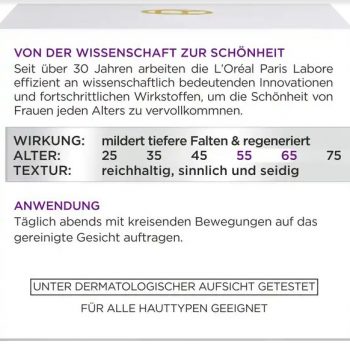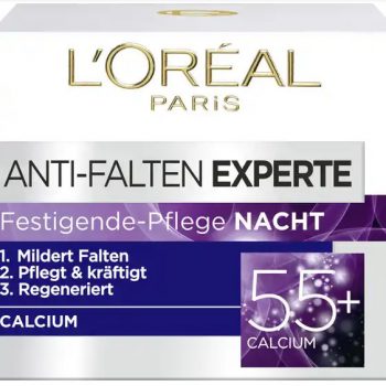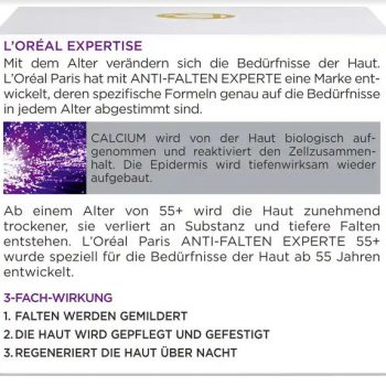 Kem dưỡng da L’Oréal Paris Anti Falten Experte 55+ được phát triển đặc biệt cho các nhu cầu của da từ 55 tuổi vào ban đêm. Được bổ sung Calcium hấp thụ vào da, có tác dụng kích hoạt lại sự gắn kết các tế bào tận sâu dưới lớp biểu bì. Tăng cường khả năng tự đổi mới tái tạo tự nhiên của da. Làm giảm các nếp nhăn sâu, cho làn da mịn và tươi trẻ.