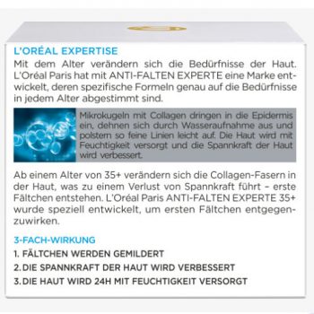 Kem dưỡng da Loreal Anti Falten Experte 35+ là dòng kem dưỡng mới ra mắt năm 2016 của Loreal Paris. Được phát triển từ dòng kem Loreal Collagen Anti Falten đã được tin dùng từ lâu. Kem dưỡng da Loreal Anti Falten Experte 35+ giúp bổ sung Collagen, làm giảm mờ nếp nhăn.
