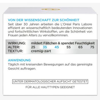 Kem dưỡng da Loreal Anti Falten Experte 35+ được sản xuất dựa trên kết quả nghiên cứu về collagen trong việc giảm nếp nhăn. Sản phẩm với công thức độc đáo giúp bổ sung Collagen cho da, dễ dàng thẩm thầu và thâm nhập vào lớp biếu bì. Collagen được bổ sung gấp 9 lần so với khi chưa sử dựng sản phẩm. Công nghệ Collagen Booster giúp da duy trì hàm lượng Collagen cần thiết. Từ đó kích thích tạo ra các sợi Collagen mới ngay từ trong cấu trúc tế bào da.
