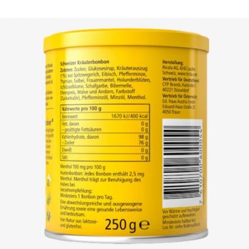 - Chứa tinh dầu bạc hà trong sự pha trộn của các loại thảo mộc được trồng theo phương pháp hữu cơ trên các vùng núi cao Thụy Sĩ giúp ngăn ngừa ho và làm dịu cơn đau họng.