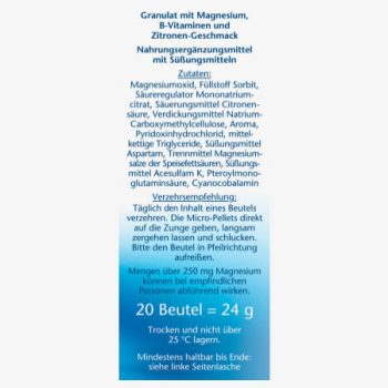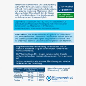 Doppelherz Magnesium 400+B6+B12 Folsaure trực tiếp cung cấp cho bạn các chất dinh dưỡng quan trọng trong dạng bột viên. Bạn có thể dùng bất cứ lúc nào mà không cần nước. Đặc biệt rất thích hợp để cung cấp cho cơ thể một cách nhanh chóng và trực tiếp với magiê khoáng và vitamin B6, B12 và acid folic.