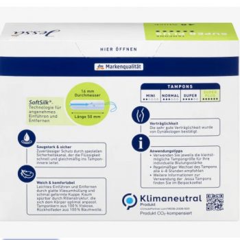 Băng vệ sinh Tampon của Jessa được phát triển bởi các bác sĩ phụ khoa của Đức, giúp dễ dàng sử dụng và bảo vệ đáng tin cậy. Công nghệ siêu mịn và bề mặt lụa mềm mại SilkTouch lướt nhẹ nhàng vào cửa mình. Các rãnh xoắn mở giúp thấm nhanh và khô thoáng. Cấu tạo rãnh xoắn mở khi thấm hút sẽ tạo ra độ chèn khít, vừa chống tràn, vừa giúp bảo vệ tuyệt đối khu vực nhạy cảm trong những ngày chu kì. Loại bỏ cảm giác ẩm ướt và mùi khó chịu như khi dùng băng vệ sinh thông thường.
