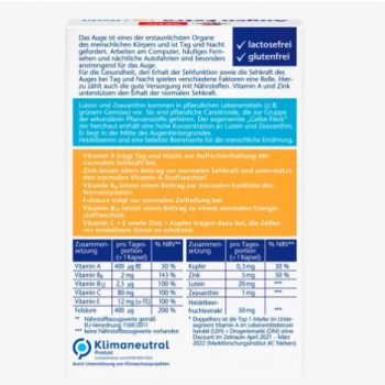 Thuốc bổ mắt augen extra tag nacht Doppelherz giàu thành phần vitamin A, C, E, B, cùng các nguyên tố vi lượng kẽm và đồng giúp nuôi dưỡng đôi mắt khỏe mạnh.