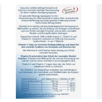 Doppelherz Gelenk 1200 được chỉ định dùng cho các trường hợp giảm đau, chống viêm và hỗ trợ phục hồi ổ khớp chắc khỏe. Thành phần có chứa vitamin C, vitamin K và vitamin D. Ngoài ra, mỗi một viên uống còn bổ sung 1200 mg glucosamine hydrochloride.