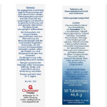 - Glucosamine hydrochloride (từ các thành phần của tôm), axit L-ascorbic, chất làm đầy polyvinylpyrrolidone, chất làm đầy polyvinylpyrrolidone, chất làm đầy cellulose, chất giải phóng silicone, chất làm đầy hydroxypropylcellulose, chất làm đầy carboxyl , Phytomenadione, cholecalciferol