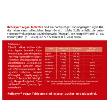 Reflexym thuần chay 100 viên của Madaus & Lauscher là một chế phẩm enzyme với mangan, hỗ trợ hình thành mô liên kết bình thường và với vitamin C, góp phần hình thành collagen bình thường cho chức năng sụn khớp. Ngoài ra, kẽm, selen và mangan giúp bảo vệ tế bào khỏi stress oxy hóa. Kẽm, selen, vitamin C, D và B12 hỗ trợ chức năng bình thường của hệ thống miễn dịch.