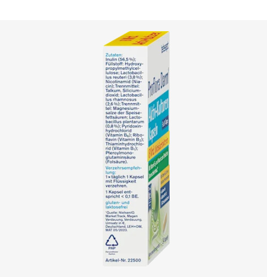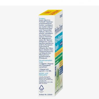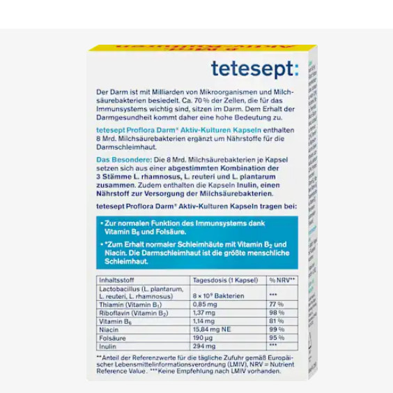 Viên nang Proflora Intestinal Active Cultures không chứa lactose của Tetesept, chứa vitamin B2, góp phần duy trì niêm mạc bình thường, bao gồm cả niêm mạc ruột. Vitamin B6 có trong viên nang có thể hỗ trợ thêm cho hệ miễn dịch khỏe mạnh.