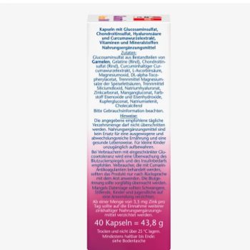 - Glucosaminsulfat aus Schalentieren (42,2%), Natriumselenit, Gelatine, hyaluronsäurehaltiges Kollagenhydrolysat (4,2%), Magnesiumoxid, Chondroitinsulfat (6,3%), DL-Alpha-Tocopherylacetat, Grünlippenmuschelpulver (6,3%), L-Ascorbinsäure, Zinkcarbonat, Trennmittel (Siliciumdioxid, Magnesiumsalze von Speisefettsäuren), Mangangluconat, Kupfergluconat, Cholecalciferol, Farbstoff (E 171)