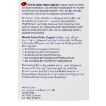 Viên uống Mivolis Sabal Kurbis là thực phẩm chức năng được sản xuất tại Đức có tác dụng cải thiện chức năng thận, bàng quang, đảm bảo hoạt động của tiền liệt tuyến, tiết niệu. Với chiết xuất từ hạt bí ngô và trái sabal, viên uống có độ an toàn, lành tính và có thể dùng được cho cả nam và nữ.