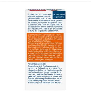 Các thành phần trong Doppelherz Heartburn Acute + Protect được giải phóng trong quá trình nhai và phát huy tác dụng vật lý trong dạ dày. Natri alginate (một loại polymer tự nhiên từ tảo nâu) tạo thành một lớp bảo vệ cùng với các muối cacbonat, giúp ngăn ngừa (về mặt cơ học) axit dạ dày trào ngược lên thực quản. Điều này bảo vệ niêm mạc thực quản và giúp giảm nhanh chóng các triệu chứng khó chịu. Hơn nữa, nó còn làm giảm độ axit của dạ dày.