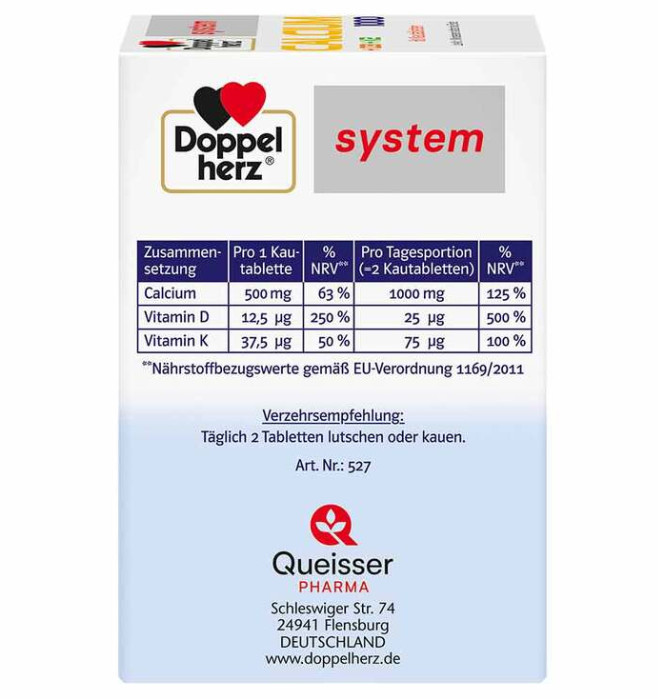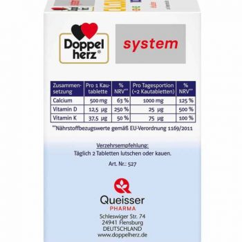 Mỗi liều (2 viên nhai) Doppelherz System Calcium 1000 D3 K2 chứa: