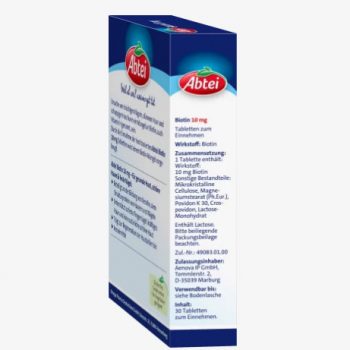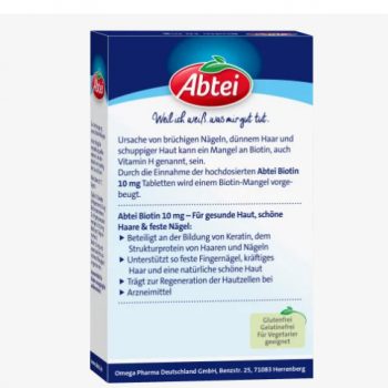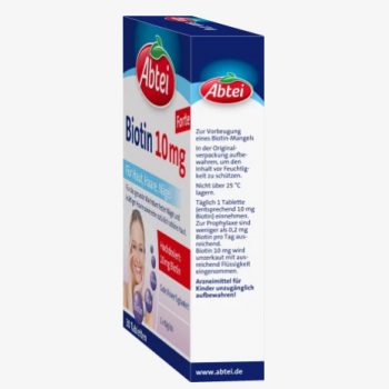 ABTEI BIOTIN 10MG là sản phẩm của Abtei – sản xuất tại Đức – bổ sung hỗ trợ sức khỏe cho da, tóc và móng tay sáng bóng dày mạnh mẽ cũng như các dây thần kinh và hệ tiêu hóa.