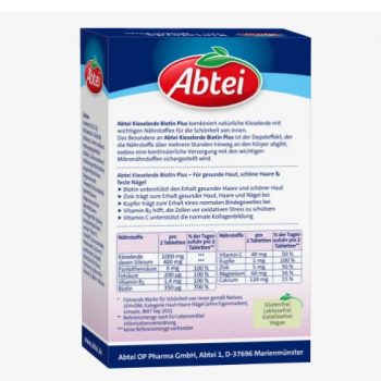 Abtei là thương hiệu hàng đầu về làm đẹp từ bên trong của Đức. Viên uống Abtei Kieselerde Biotin Plus với kẽm đồng và biotin mang đến sự đóng góp quý giá cho vẻ đẹp tự nhiên từ trong ra ngoài. Sản phẩm hoàn toàn tự nhiên cung cấp tất cả các chất quan trọng cần thiết để giúp da, tóc và móng khỏe mạnh hơn và thúc đẩy quá trình trao đổi chất của các mô liên kết.