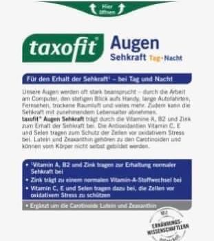 – Đôi mắt của chúng ta thường bị căng thẳng do làm việc trên máy tính, liên tục nhìn vào điện thoại di động, đi ô tô đường dài, xem TV, không khí trong nhà khô ráo và nhiều hơn thế nữa. Ngoài ra, thị lực có thể giảm theo tuổi tác. taxofit Eyes Vision với vitamin A, B2 và kẽm giúp duy trì thị lực và chất chống oxy hóa vitamin C, E và selen giúp bảo vệ tế bào khỏi stress oxy hóa. Lutein và zeaxanthin được bổ sung cũng thuộc nhóm carotenoid và cơ thể không thể tự sản xuất được.