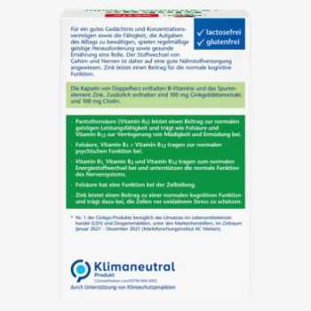 Viên uống bổ não Doppelherz Aktiv Ginkgo của Đức với công thức kết hợp giữa ginkgo, vitamin nhóm B và cholin, viên uống bổ não Đức Doppelherz Aktiv giúp tăng cường bổ sung dưỡng chất cho não, tăng cường trí nhớ, khả năng tập trung hiệu quả