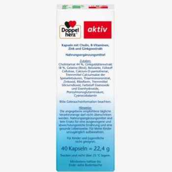 - Choline tartrat 44%, chiết xuất lá ginkgo 18%, gelatin, tinh bột gạo, Fullstoff Cellulose, canxi D-pantothenate, chất giải phóng muối canxi của axit béo, chất tạo màu oxit sắt và hydroxit sắt, thiamin mononitrat, kẽm, riboflavin, Trennmittel Siliciumdioxid, titan dioxide, Pteroylmonoglutaminsäure, cyanocobalamin