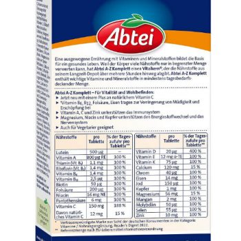 Một chế độ ăn uống cân bằng với vitamin và khoáng chất tạo thành nền tảng cho một cuộc sống khỏe mạnh. Nếu Chế độ ăn hàng ngày của bạn không thể cung cấp đủ lượng vitamin và khoáng chất thiết yếu cho cơ thể thì Abtei AZ Complete chứa 25 loại chất dinh dưỡng với các vitamin và khoáng chất quan trọng với hàm lượng theo tiêu chuẩn quy định sẽ là 1 lựa chọn tốt nhất cho bạn: