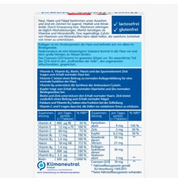 Viên uống đẹp da, tóc, móng Doppelherz aktỉv Haut + Haare + Năgel có chứa 100 mg chiết xuất từ quà lưu, 50 mg Silica và 3mg acid hyaluronic và nhiều vi chất dinh dưỡng cần thiết (kẽm, vitamin A, C, E, B, Biotin, đồng, Silica, axit folic, magie…) làm đẹp da, tóc, mỏng và hỗ trợ nhiều chức năng khác trong cơ thể.