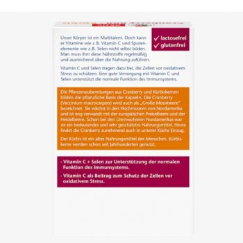 Doppelherz Cranberry + Pumpkin + Vitamin C + Selenium, viên nang được chiết xuất từ quả nam việt quất và bí ngô. Sản phẩm giúp hỗ trợ tăng cường cho sức khỏe đường tiết niệu, hỗ trợ chức năng miễn dịch và bảo vệ tế bào khỏi stress oxy hóa.