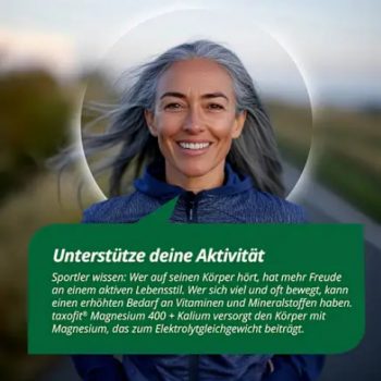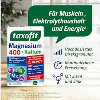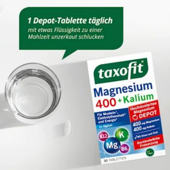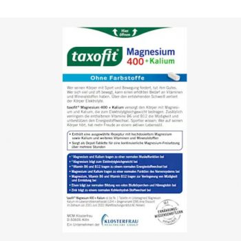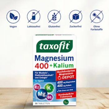 Viên uống Taxofit Magnesium 400 + Kalium cung cấp cho cơ thể magiê, góp phần cân bằng điện giải, và kali. Các vitamin B6 và B12 đi kèm cũng hỗ trợ chuyển hóa năng lượng. Sắt góp phần hình thành hồng cầu và hemoglobin bình thường. Magiê, vitamin B6 và vitamin B12 góp phần giảm mệt mỏi và kiệt sức.