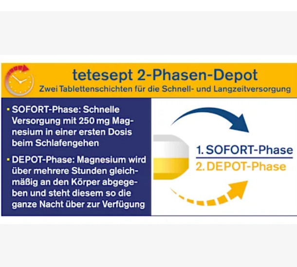 Viên nén Tetesept Magnesium Nighttime cung cấp cho cơ thể một liều lượng magiê cao, góp phần duy trì chức năng cơ bắp và hệ thần kinh bình thường. Khi uống vào buổi tối, cơ chế giải phóng 2 pha đảm bảo cơ thể được cung cấp magiê suốt đêm, giúp ngủ ngon hơn.