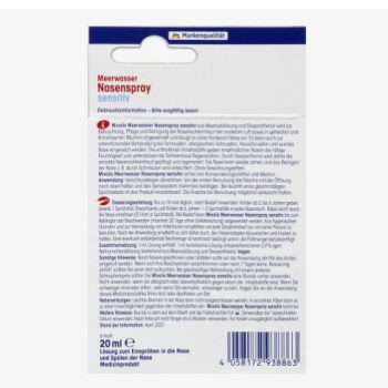 Xịt mũi nhạy cảm Mivolis được làm từ dung dịch muối biển và dexpanthenol có tác dụng làm ẩm, chăm sóc và làm sạch niêm mạc mũi trong không khí khô hay điều hòa hoặc hít phải khói bụi bẩn. Nó cũng được sử dụng để hỗ trợ điều trị viêm mũi, cảm cúm, viêm xoang… Các thành phần có trong sản phẩm cung cấp độ ẩm cần thiết cho mũi nhạy cảm và hỗ trợ quá trình tái tạo màng nhầy để chống viêm hay kích ứng. Sản phẩm không chứa chất bảo quản và cồn.