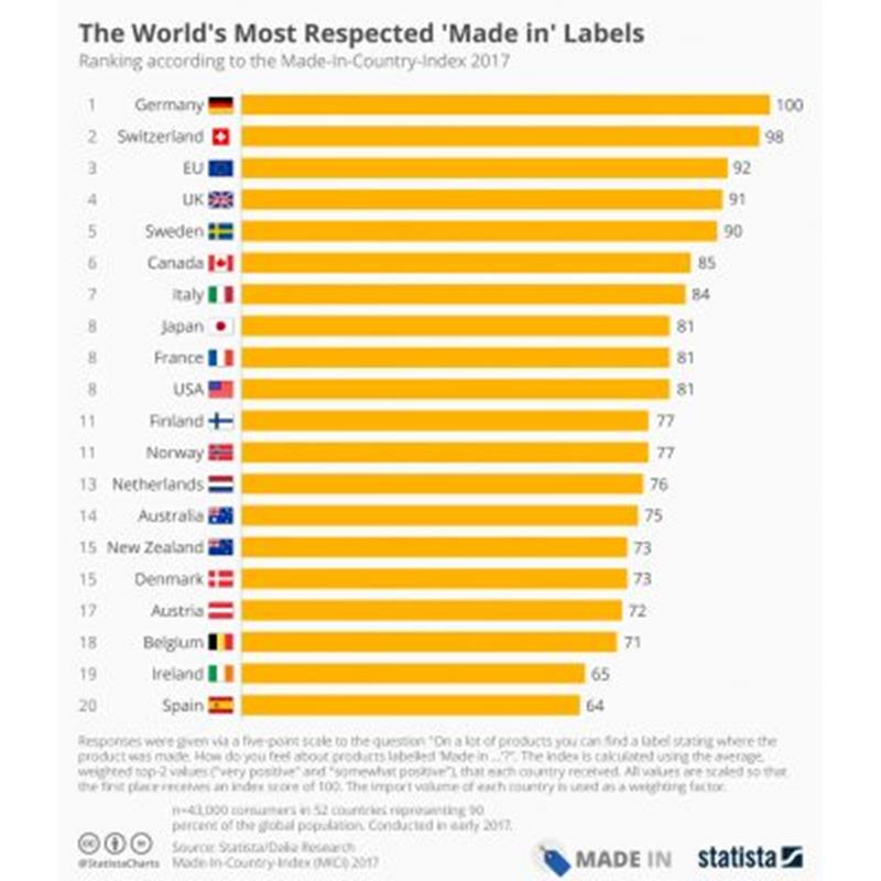Việc quảng bá thương hiệu dạng “Made in” được bắt đầu từ Anh vào cuối thế kỷ 19 để bảo vệ nền kinh tế của họ khỏi sản phẩm làm nhái chất lượng thấp từ Đức thời đó. Trớ trêu thay, giờ Đức nằm đầu bảng trong khi Anh bị đẩy xuống thứ 4 (vẫn là một vị trí rất tốt). Sản phẩm sản xuất ở Mỹ được yêu thích trên thế giới nhưng thương hiệu “Made in USA” chỉ đứng ngang với Pháp và Nhật ở vị trí thứ 8. Trong các nước khảo sát, Trung Quốc chiếm vị trí áp chót với 28 điểm trong khi Iran đứng cuối với 27 điểm.